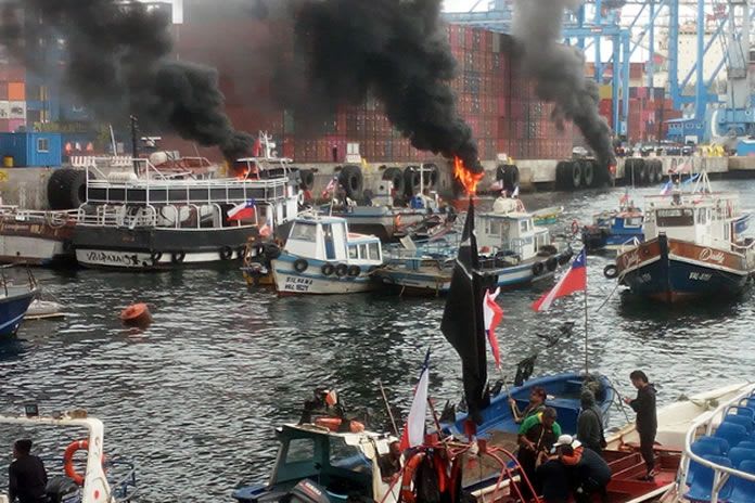 Las manifestaciones derivaron en disturbios y enfrentamientos entre Carabineros y pescadores, la Policía chilena, quienes denunciaron que fueron «masacrados», según la Presidenta de la Agrupación de Mujeres Charqueadoras de Caleta Portales, Maritza Carretero.